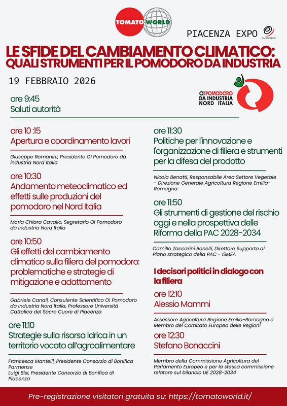 L'OI Pomodoro da Industria Nord Italia, nell'ambito dell'evento fieristico Tomato World, che si svolgerà nelle giornate del 19 e 20 febbraio presso Piacenza Expo, ha organizzato il convegno di apertura:"Le sfide del cambiamento climatico: quali strumenti per la filiera del pomodoro" che si terrà giovedì 19 febbraio alle ore 9:45